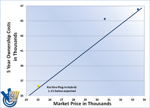 The Kia Niro Plug-In Hybrid won the Vincentric Best CPO Value in America™ award in the Electric/Plug-In Hybrid SUV/Crossover segment. Having the lowest maintenance costs and lowest total cost of ownership in its class helped it achieve the 2020 victory.