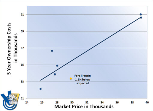 The Ford Transit was victorious for the fourth consecutive year in the Large Cargo Van segment of the Vincentric Best CPO Value in America™ awards. The Transit outperformed six competitor vehicles to earn its spot in the winner’s circle.
