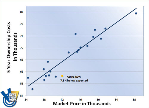 The Acura RDX won the 2020 Vincentric Best Value in America™ award for the Luxury Compact SUV/Crossover segment. Having the lowest insurance and repair costs in its class helped the RDX land a spot in the winner's circle.