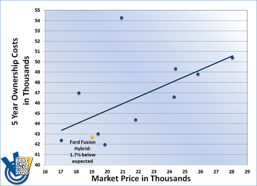 The Ford Fusion Hybrid won the 2020 Vincentric Best CPO Value in Canada™ award in the Hybrid segment. Having the lowest maintenance cost in its class was a key factor in outperforming 10 competitor models and earning the top spot.