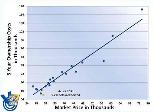 The Acura RDX won the 2020 Vincentric Best CPO Value in Canada™ award in the Luxury Compact SUV/Crossover segment. Its lowest insurance cost in its class was a key factor in the RDX outperforming 21 competitor models.