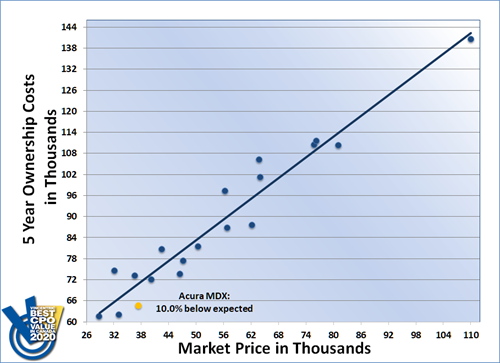 The 2020 Vincentric Best CPO Value in Canada Awards are based on the average of all trim levels for each model from the 2015-2019 model years. Costs are based on 5 years of ownership with annual mileage of 20,000 kilometers. Graph shown is a visual representation of the actual results, but may not reflect the exact calculations. To learn more about this graph and how Vincentric measures value, click here.