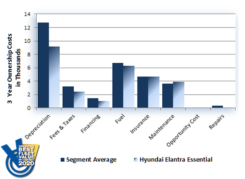 The Hyundai Elantra Essential took home the victory in the Compact segment of the 2020 Vincentric Best Fleet Value in Canada™ awards. The Elantra Essential outperformed the competition by having the lowest depreciation and repair costs in its class. This year marks the third overall win for the Hyundai Elantra in the Compact segment.