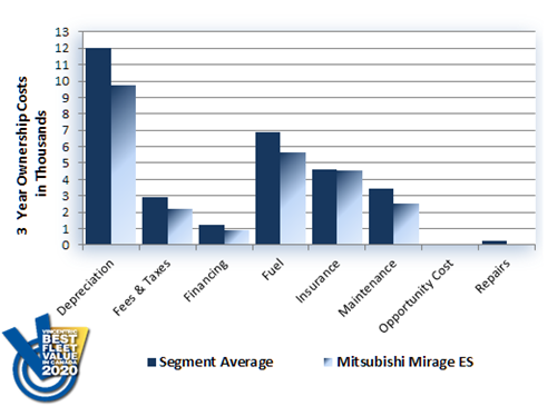 The Mitsubishi Mirage ES won the 2020 Vincentric Best Fleet Value in Canada™ award in the Subcompact segment. Key factors in taking home the win were the Mirage ES's lowest operating and fixed costs in its class. This is the fourth time Mitsubishi has had a Mirage in the winner's circle.