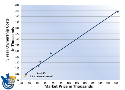 The Audi A3 earned its third win in the Luxury Convertible segment of the Vincentric Best Value in Canada™ awards. The A3 outperformed its competitors by having the lowest repair costs, best fuel economy, and lowest total cost of ownership in its class.