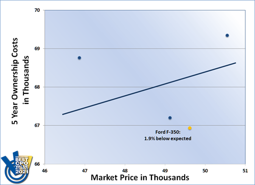 For the second time, the Ford F-350 earned the Vincentric Best CPO Value in America™ award in the Full-Size 1-Ton Pickup segment. Having the lowest operating, repair, and maintenance costs in its class helped lead the F-350 to the top of the 2021 podium.
