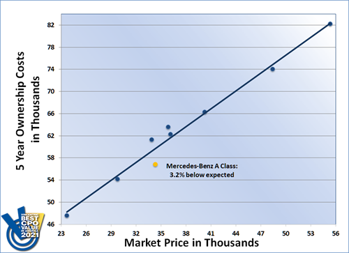 The Mercedes-Benz A-Class came out on top of the Luxury Compact segment of the 2021 Vincentric Best CPO Value in America™ awards. Its lowest insurance and repair costs helped deliver this year's win.