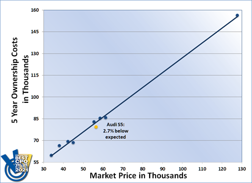 The Audi S5 won the 2021 Vincentric Best CPO Value in America™ award in the Luxury Convertible segment. The S5 had ownership costs that were 2.7% lower than expected for its segment, paving the way for the S5 to outperform seven competitor models.