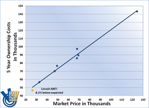 The Lincoln MKT is no stranger to the winner's circle, returning as the top performer in the Luxury Large SUV/Crossover segment of the Vincentric Best CPO Value in America™ awards for the fourth time overall and the third year in a row. The MKT had the lowest operating, depreciation, insurance, and maintenance costs in its class, in addition to the best fuel economy in its class, all of which contributed to its award-winning performance for 2021.