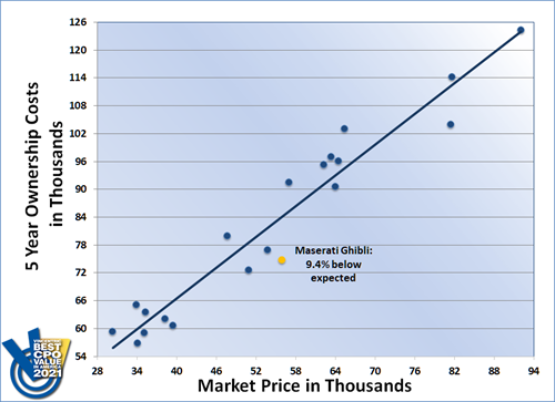 The Maserati Ghibli won the 2021 Vincentric Best CPO Value in America™ award in the Luxury Large Sedan segment. The Ghibli outperformed 19 competitor models with ownership costs 9.4% lower than expected for its segment.
