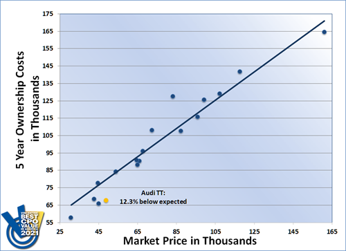 The Audi TT returned as the winner of the Luxury Sports Car segment of the Vincentric Best CPO Value in America™ awards for the third time. The 2021 victory was aided by having the lowest maintenance and operating costs in its class, along with the best fuel economy in its class.