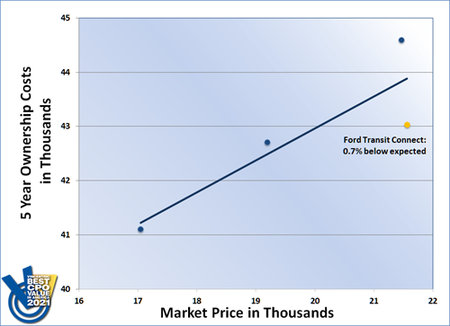The Small Commercial Cargo Van segment of the 2021 Vincentric Best CPO Value in America™ awards was claimed by the Ford Transit Connect, aided by having the lowest operating and maintenance costs in its class.