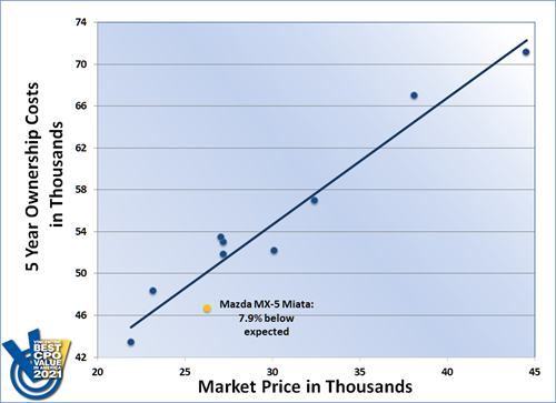 The Mazda MX-5 Miata outperformed the competition in the Sports Car segment of the 2021 Vincentric Best CPO Value in America™ awards. The MX-5 Miata had the lowest insurance cost in its class and ownership costs 7.9% lower than expected.
