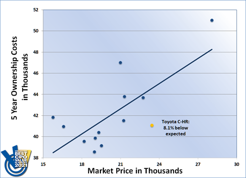 The Toyota C-HR triumphed in the Subcompact SUV/Crossover segment of the 2021 Vincentric Best CPO Value in America™ awards. The C-HR had ownership costs that were 8.1% lower than expected, propelling it to the top of the podium.