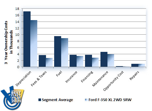 The Ford F-350 XL Reg Cab 2WD SRW returned as the winner of the Full-Size 1-Ton Pickup segment of the 2021 Vincentric Best Fleet Value in America™ awards. This winner impressed by having the lowest fuel, insurance, maintenance, and operating costs in its class, which helped lead it to this fifth overall victory for the F-350 XL.