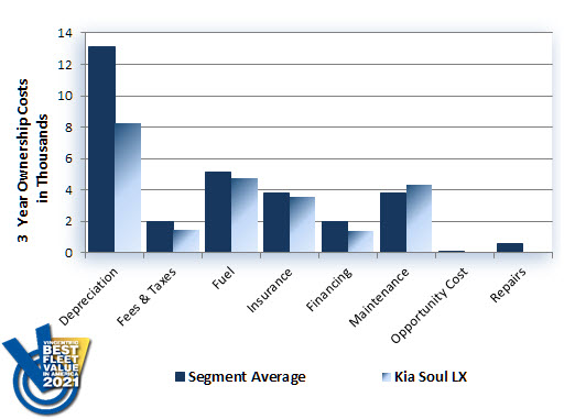The Kia Soul LX claimed victory in the Compact Hatchback segment of the 2021 Vincentric Best Fleet Value in America™ awards. Having the lowest depreciation cost in its class was a key factor in the Soul LX winning all 28 measured lifecycle cost scenarios.