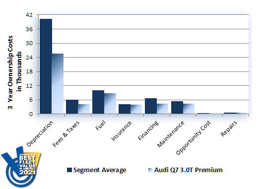 The Audi Q7 3.0T Premium came out on top of the Luxury Large SUV/Crossover segment of the 2021 Vincentric Best Fleet Value in America™ awards. In an impressive performance, the Q7 3.0T Premium outperformed the competition in all 28 measured lifecycle cost scenarios.