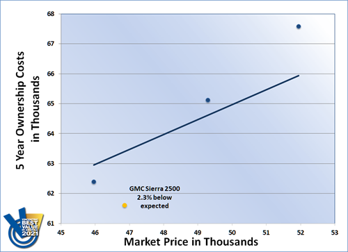 For the second time, the GMC Sierra 2500 took home the Vincentric Best Value in America™ award in the Full-Size 3/4-Ton Pickup segment. Having the lowest depreciation cost in its class led the Sierra 2500 to the top of the 2021 podium.