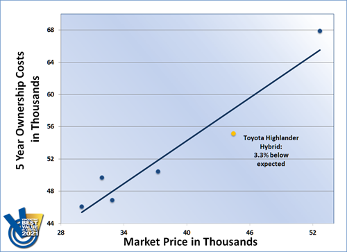 The Toyota Highlander Hybrid returned as the winner of the Hybrid SUV/Crossover segment of the Vincentric Best Value in America™ awards. 2021 marks the second consecutive year and eighth time overall that the Highlander Hybrid has triumphed in this segment.