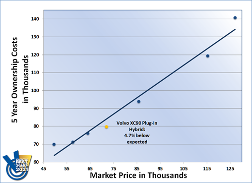 The Volvo XC90 Plug-In Hybrid won the 2021 Vincentric Best Value in America™ award in the Luxury Electric/Plug-In Hybrid SUV/Crossover segment. The XC90 Plug-In Hybrid outperformed five competitor models, allowing it to earn victory in this segment for the fourth time.