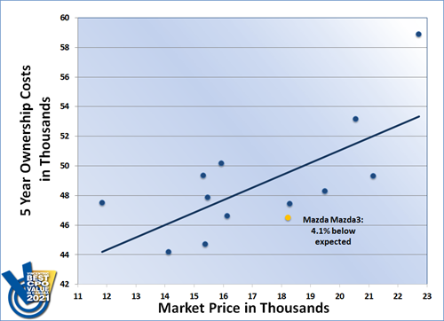 Returning to the winner's circle for the third consecutive year, the Mazda3 triumphed in the Compact segment of the Vincentric Best CPO Value in Canada™ awards. Having the lowest operating cost in its class was a key factor that helped the Mazda3 outperform 12 competitors and take home the win for 2021.