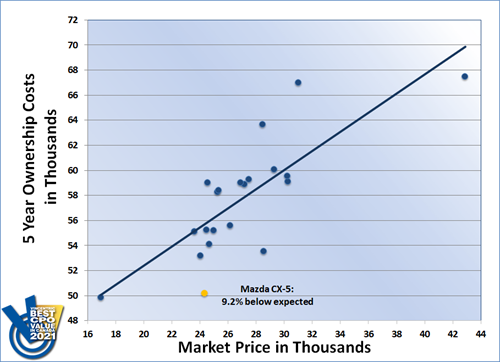 For the third year in a row, the Mazda CX-5 took home the win in the Compact SUV/Crossover segment of the Vincentric Best CPO Value in Canada™ awards. Having the lowest operating cost in its class was a key factor that helped the CX-5 outperform 20 competitor models and claim the 2021 victory.