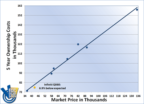 Returning for the second time, the Infiniti QX60 won the Luxury Large SUV/Crossover segment of the Vincentric Best CPO Value in Canada™ awards. Having the lowest repair, fuel, and operating costs in its class helped lead the QX60 to the 2021 podium.
