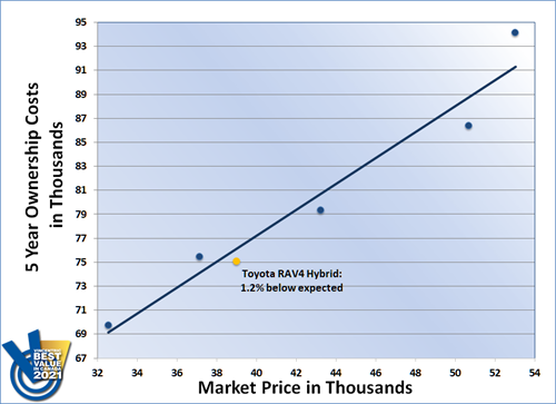 2021 marks the second time that the Toyota RAV4 Hybrid has come out on top of the Hybrid SUV/Crossover segment of the Vincentric Best Value in Canada™ awards. Aided by having the lowest depreciation cost in its class, the RAV4 Hybrid rose to the top and outperformed 3 competitor models.