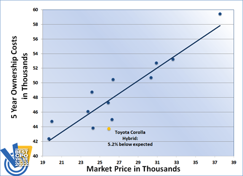 The Hybrid segment of the 2022 Vincentric Best CPO Value in America™ awards was conquered by the Toyota Corolla Hybrid. Having the lowest operating and maintenance costs in its class helped lead the Corolla Hybrid to victory.