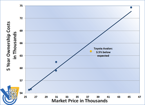 For an outstanding eighth consecutive year, the Toyota Avalon was honored with the Vincentric Best CPO Value in America™ award in the Large Sedan segment. The Avalon's impressive performance for 2022 was aided by having the lowest insurance cost and repair costs in its class.
