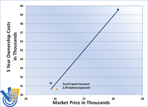 Returning for the fifth consecutive year, the Ford Transit Connect triumphed in the Small Commercial Passenger Van segment of the Vincentric Best CPO Value in America™ awards. In an impressive performance, the Transit Connect had the lowest repair, maintenance, insurance, fuel, and operating costs, as well as the lowest total cost of ownership in its class, which helped it earn the 2022 win.