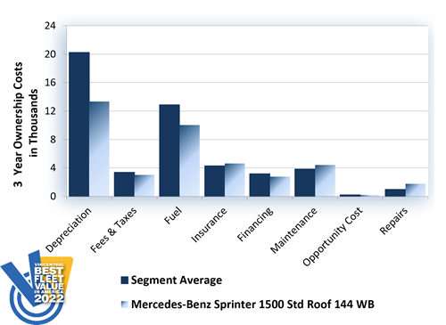 For the third year in a row, the Mercedes-Benz Sprinter 1500 Std Roof 144 WB triumphed in the Full-Size 1/2-Ton Cargo Van segment of the Vincentric Best Fleet Value in America™ awards. The Sprinter 1500 rose to the top for 2022 by having the lowest depreciation, fuel, and operating costs in its class.