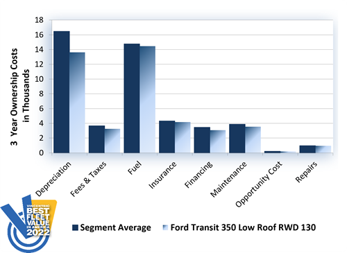 The Ford Transit 350 Cargo Low Roof RWD 130 won the 2022 Vincentric Best Fleet Value in America™ award in the Full-Size 1-Ton Cargo Van segment. The Transit 350 Cargo had the lowest insurance, depreciation, and maintenance costs in its class, propelling it into the winner's circle for the third time.