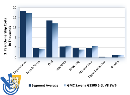 The GMC Savana G3500 6.6L V8 SWB was honored with the Vincentric Best Fleet Value in America™ award in the Full-Size 1-Ton Passenger Van segment. The Savana G3500 earned the top spot for 2022 due in no small part to having the lowest fuel and repair costs in its class.