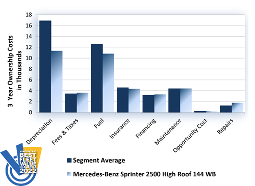 The Mercedes-Benz Sprinter 2500 High Roof 144 WB won the 2022 Vincentric Best Fleet Value in America™ award in the Full-Size 3/4-Ton Passenger Van segment. This fourth-time victory for the Sprinter 2500 was aided by having the lowest insurance, operating, and fuel costs in its class.