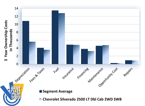 The Chevrolet Silverado 2500 LT Dbl Cab 2WD SWB won the 2022 Vincentric Best Fleet Value in America™ award in the Full-Size 3/4-Ton Pickup segment. The Silverado 2500 LT outperformed the competition in 13 out of 28 measured lifecycle cost scenarios, allowing it to earn this third-time victory.