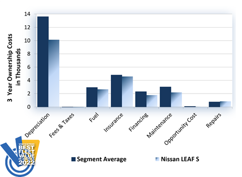 Returning to the winner's circle for the fifth time, the Nissan LEAF S won the 2022 Vincentric Best Fleet Value in America™ award in the EV/PHEV segment. The LEAF's lowest operating costs in its class helped it win 25 out of 28 measured lifecycle cost scenarios and led it to this repeat victory.