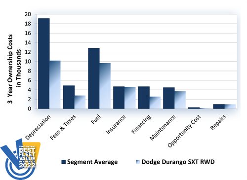 The Dodge Durango SXT RWD came out on top of the Large SUV segment of the Vincentric Best Fleet Value in America™ awards. The Durango had an impressive performance for 2022 with the lowest depreciation, fuel, and operating costs in its class.