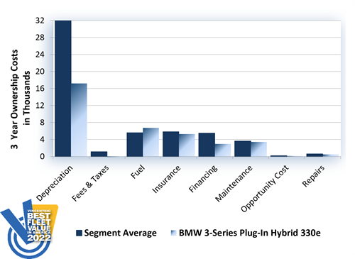 The Luxury EV/PHEV segment of the 2022 Vincentric Best Fleet Value in America™ awards was conquered by the BMW 3-Series Plug-In Hybrid 330e. The 3-Series won 20 out of 28 measured lifecycle cost scenarios to rise to the top of the podium.