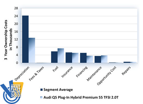 For the second year in a row, the Audi Q5 Plug-In Hybrid Premium 55 TFSI 2.0T earned the Vincentric Best Fleet Value in America™ award in the Luxury EV/PHEV SUV segment. The Q5 Plug-In Hybrid won 22 out of 28 measured lifecycle cost scenarios to bring home this repeat victory for 2022.
