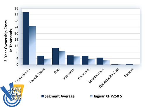 The Jaguar XF P250 S won the 2022 Vincentric Best Fleet Value in America™ award in the Luxury Large Sedan segment, aided by having the lowest insurance and operating costs in its class, as well as the best fuel economy.
