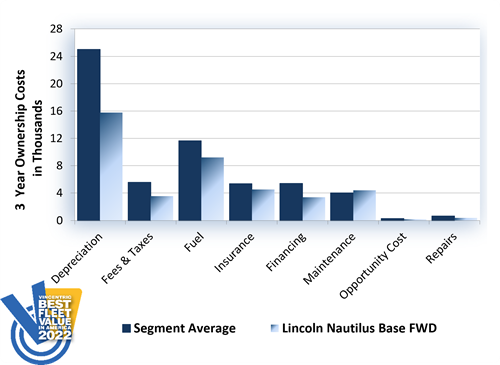 Returning for the fourth consecutive year, the Lincoln Nautilus Base FWD won the Luxury Mid-Size SUV segment of the Vincentric Best Fleet Value in America™ awards. Having the best fuel economy and the lowest operating costs in its class helped propel the Nautilus back into the winner's circle for 2022.