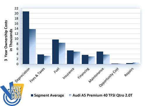 The Audi A5 Premium 40 TFSI Qtro 2.0T earned victory in the Luxury Mid-Size Sedan segment of the 2022 Vincentric Best Fleet Value in America™ awards. Having the lowest insurance cost in its class was a key factor that helped the A5 Premium win 16 out of 28 measured lifecycle cost scenarios.