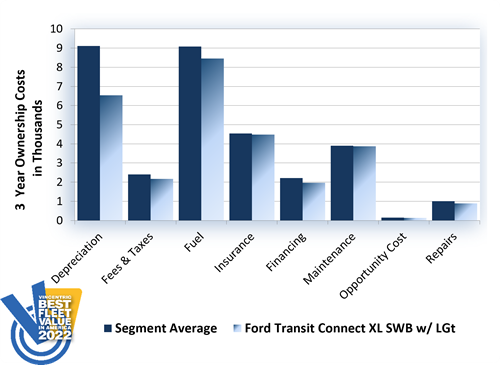 Returning to the top of the podium for the fifth time, the Ford Transit Connect XL SWB w/ LGt won the 2022 Vincentric Best Fleet Value in America™ award in the Small Commercial Cargo Van segment. This year's repeat victory was aided by having the best fuel economy and the lowest maintenance cost in its class.