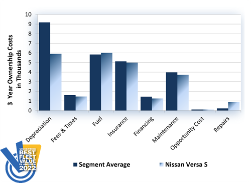 The Nissan Versa S won the 2022 Vincentric Best Fleet Value in America™ award in the Subcompact segment. Having the lowest maintenance cost in its class was a key factor that helped the Versa claim its seventh victory in this segment.