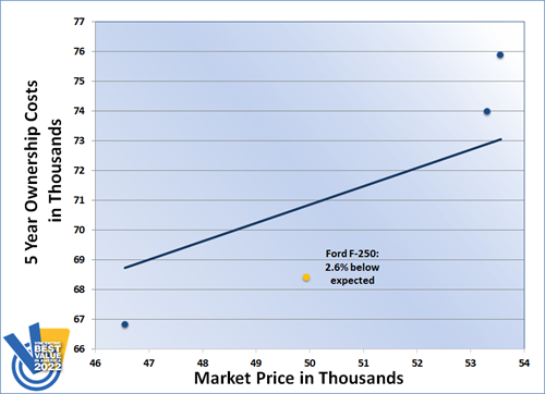 The Ford F-250 received the Vincentric Best Value in America™ award in the Full-Size 3/4-Ton Pickup segment, making this the fourth time it has been in the winner's circle. Having the lowest fuel and operating costs in its class helped the F-250 take top honors for 2022.