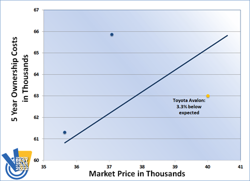 In an outstanding showing, the Toyota Avalon returned as the winner of the Large Sedan segment of the Vincentric Best Value in America™ awards for the fourteenth time! The Avalon had the lowest fuel, insurance, operating, and repair costs, which helped propel the Avalon to victory for 2022.