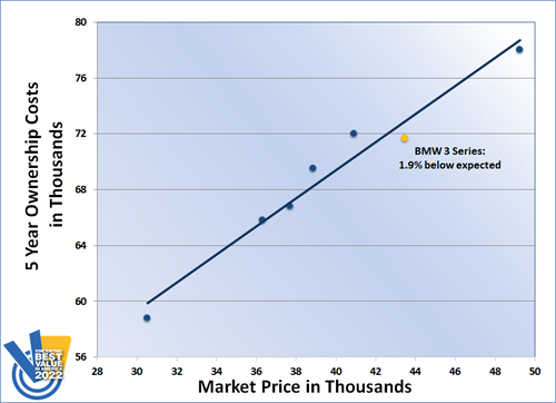 The BMW 3 Series took home the 2022 Vincentric Best Value in America™ award in the Luxury Compact segment. Key factors in this second-time win were the 3 Series’ lowest fuel, maintenance, and operating costs in its class.