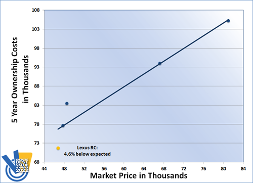 The Lexus RC claimed the top spot in the Luxury Coupe segment of the Vincentric Best Value in America™ awards for the fifth time. In an impressive performance, the RC had the lowest depreciation, insurance, and total ownership costs in its class for 2022.