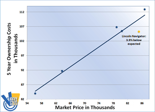 The Lincoln Navigator earned the Vincentric Best Value in America™ award for the third time in the Luxury Large SUV segment, thanks to 2022 ownership costs that were over 3% lower than expected.